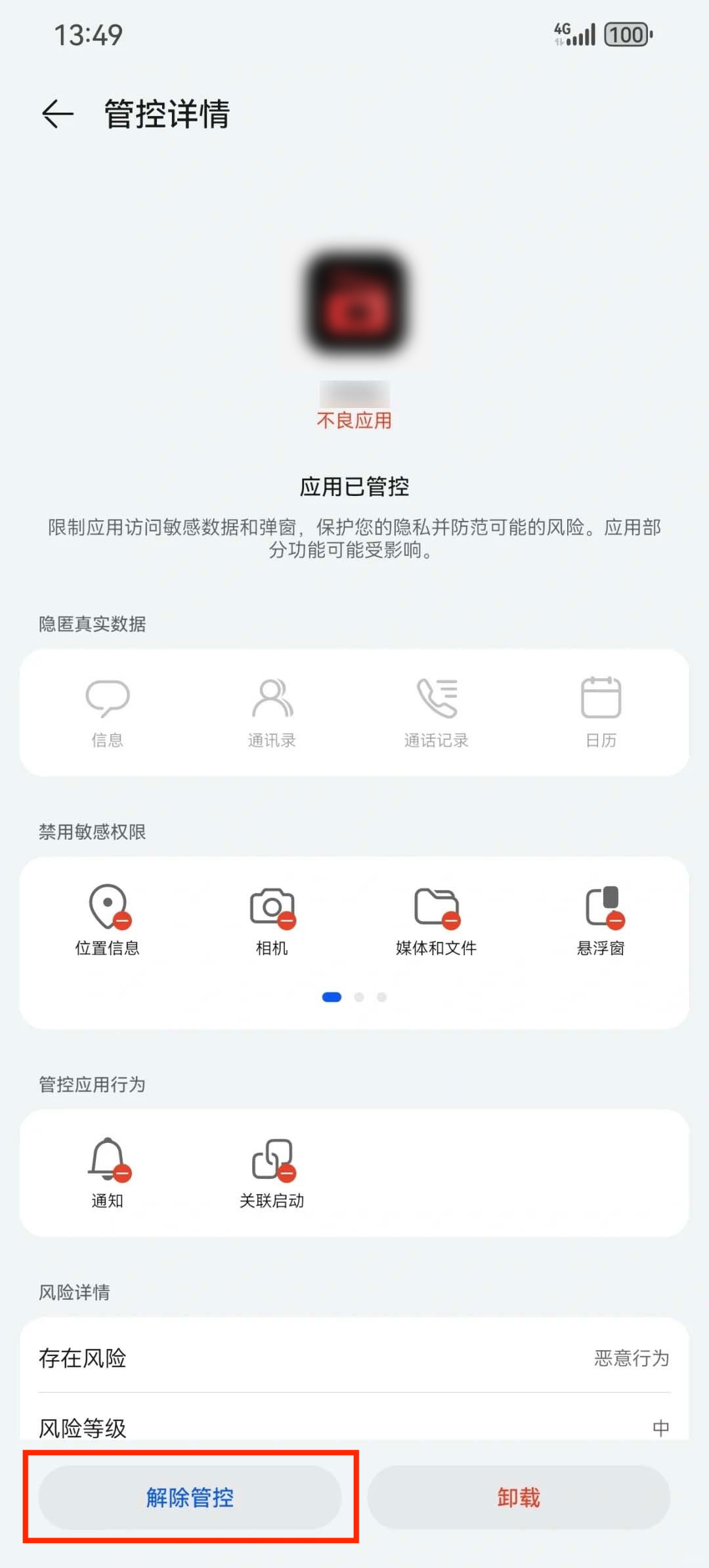 2.点击被管控的应用,点击左下角的“解除管控”